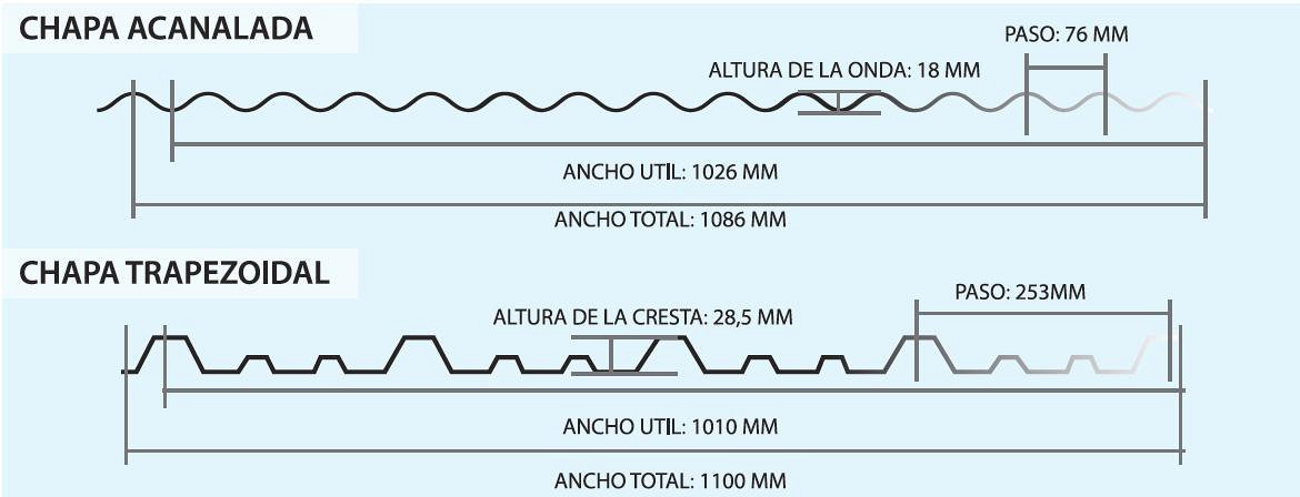 Las chapas acanaladas son muy utilizadas en cubiertas residenciales, comerciales, agrícolas o industriales, paneles y cerramientos laterales.